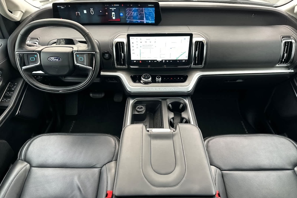 2ND ROW POWER-FOLDING 40/20/40 BENCH SEAT 8-passenger seating, tip-and-slide. 2025 Ford Expedition Max with Dark Matter Gray exterior and Black Onyx interior features a V6 Cylinder Engine with 400 HP at 5200 RPM*.