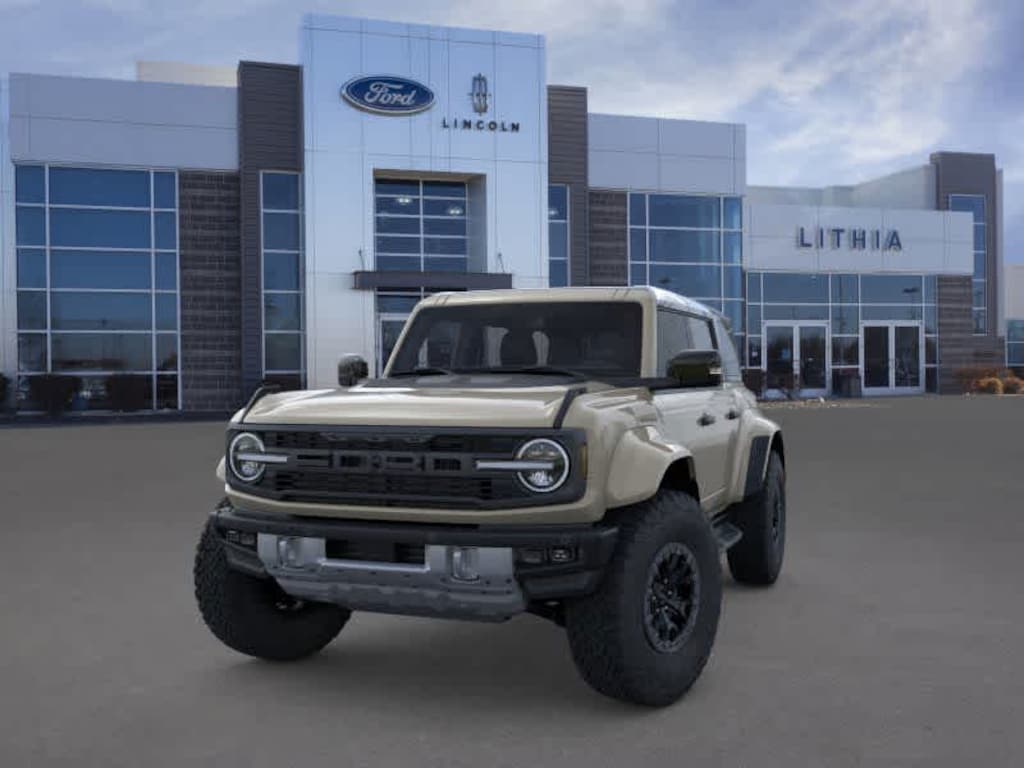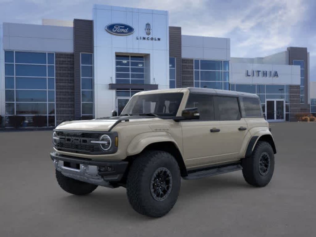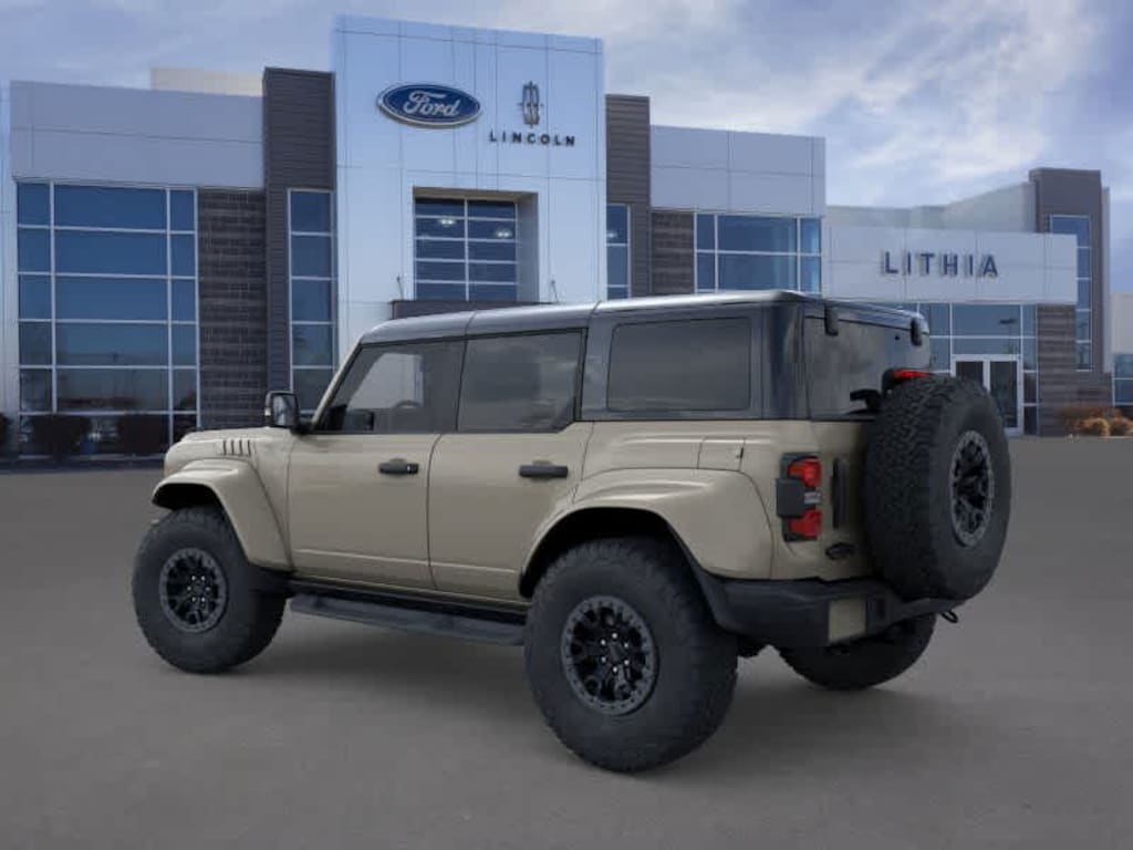 RAPTOR BLACK APPEARANCE PACKAGE unique hood matte black graphics package, Interior Carbon Fiber Pack, Gloss Black Sideview Mirror Skull Caps, Wheels: 17 Dark Carbonized Gray Alloy Painted, Beadlock capable forged, SHADOW BLACK PAINTED HARD TOP Rear-Window Defroster & Washer, Hard Top Sound Deadening Headliner, TRANSMISSION: 10-SPEED AUTOMATIC trail control, trail turn assist and trail one-pedal driving (STD), ENGINE: 3.0L ECOBOOST V6 (STD). 2025 Ford Bronco with Desert Sand exterior and Black Onyx interior features a V6 Cylinder Engine with 418 HP at 5750 RPM*.
