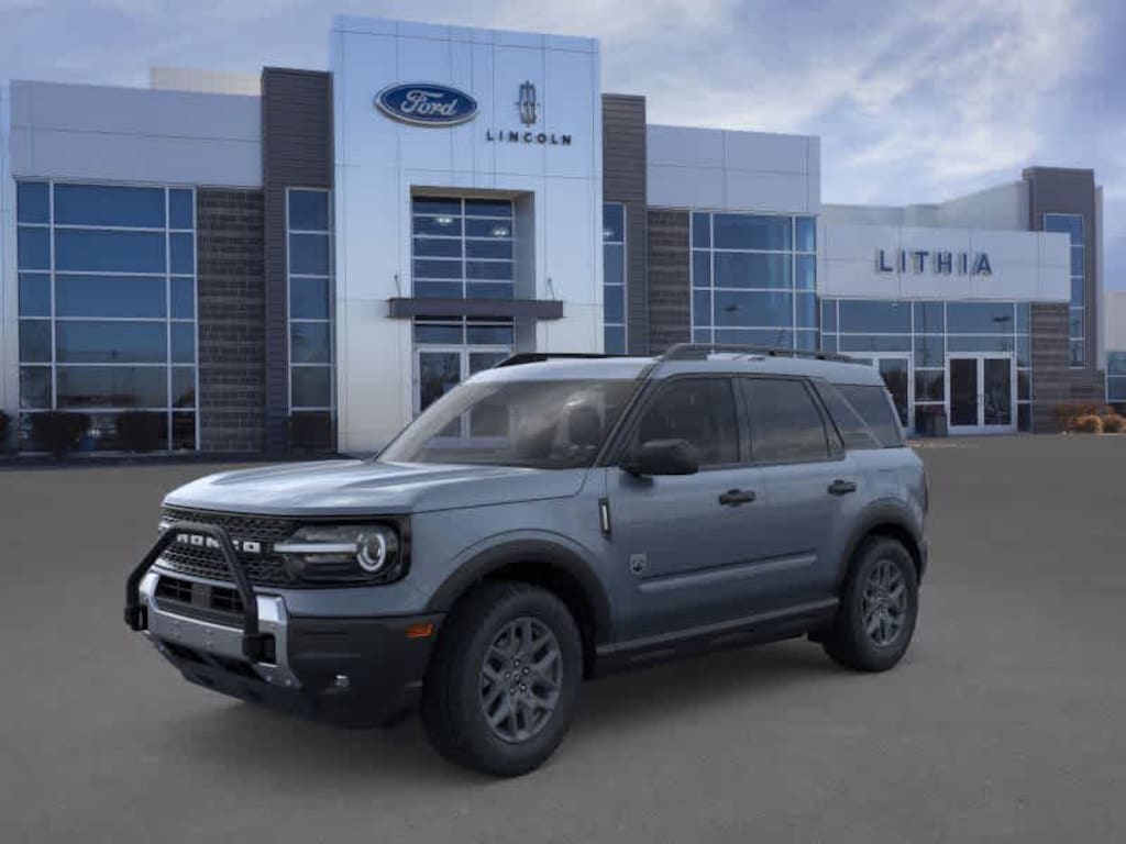 BLACK DIAMOND OFF-ROAD PACKAGE Deletes standard tire inflator and sealant kit and overhead console w/sunglasses storage, Brush Guard, Recovery Hooks, 2 casted in front and 2 D-ring in rear, 2nd Row Carpeted Seatback, rubberized seatback mat, Auxiliary Switches & Wiring, Class II Trailer Tow Pack w/Trailer Sway Control, full size spare wheel, full size spare tire and rubberized cargo floor, Underbody Protection, steel skid plate under engine and steel canister shield, Cargo Mat, Front & Rear Black Bumpers, Molded-in-color w/steel plates, Cargo Management System (Shelf/Divider/Table), Interior Grab Handle, 1 in the center floor console front row passenger side, Fender Tie Downs, 110V/400W AC Power Outlet, Behind center console and cargo area, Wheels: 17 Carbonized Gray Painted Aluminum, CONVENIENCE PACKAGE Heated 8-Way Power Drivers Seat, (Fore/aft, up/down, recline, lumbar), Front Driver/Passenger Seat Back Map Pockets, Universal Garage Door Opener (UGDO), Premium Wrapped Steering Wheel, LED Fog Lamps. 2025 Ford Bronco Sport with Azure Gray Metallic Tri-Coat exterior and Medium Light Smoked Truffle interior features a 3 Cylinder Engine with 181 HP at 6000 RPM*.