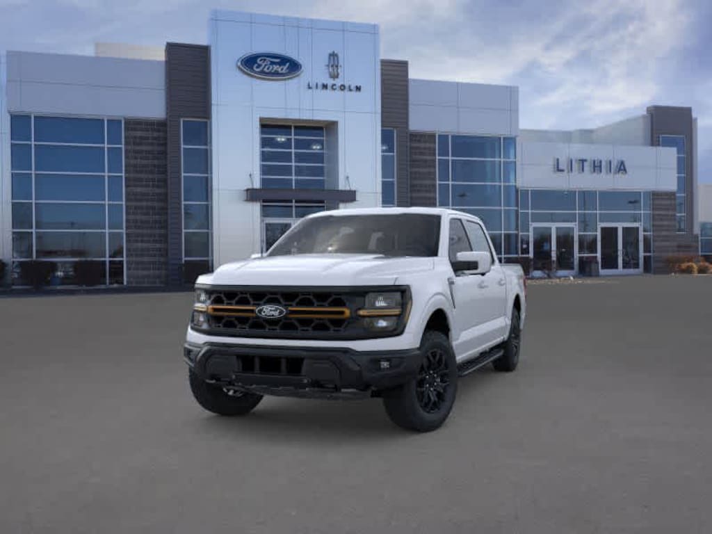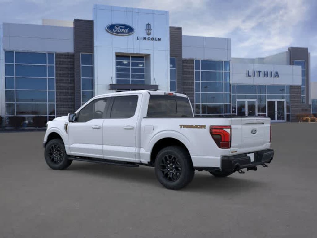 EQUIPMENT GROUP 402A HIGH Power-Adjustable Pedals w/Memory, Bed Utility Package, Tailgate Step w/Tailgate Work Surface, LED Box Lighting, Power Tailgate, 4 Pickup Box Tie-Down Plates, Premium Wrapped Steering Wheel, Modular Front Bumper & Carbon Black Rear Bumper, Mobile Office Package, Wireless Charging, Partitioned Lockable Rear Storage, Console Worksurface, Media Bin Door, Hi-Lock Transfer Case, Power Glass Heated Sideview Mirrors, power-folding, turn signal, auto-dimming feature (drivers side), high-intensity LED security approach lamps, LED sideview mirror spotlights and body-color skull caps, Auto-Dimming Rearview Mirror, Ambient Lighting, LED Taillamps, Two-Speed Automatic AWD w/Mechanical Locking 4WD, Radio: B&O Unleashed Sound System by Bang & Olufsen, HD Radio and 14 speakers, TRANSMISSION: ELECTRONIC 10-SPEED AUTOMATIC SelectShift w/progressive range select and selectable drive modes: normal, ECO, sport, tow/haul, slippery, deep snow/sand and mud/rut (STD). 2025 Ford F-150 with Space White exterior and Black interior features a 8 Cylinder Engine with 400 HP at 6000 RPM*. Approx. Original Base Sticker Price: $79,600*.