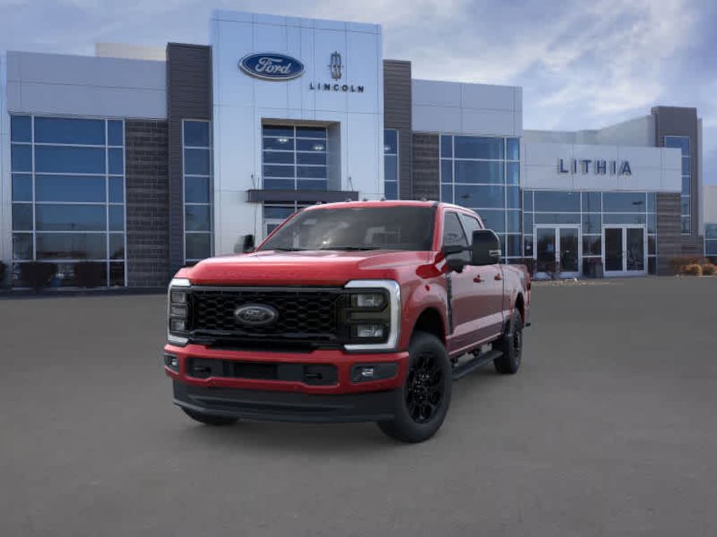 ENGINE: 6.7L 4V OHV POWER STROKE V8 TURBO DIESEL B20 manual push-button engine-exhaust braking and Operator Commanded Regeneration (OCR), 250 Amp Alternator, 34 Gallon Fuel Tank, 3.31 Axle Ratio, Dual AGM 68 AH Battery, BLACK APPEARANCE PACKAGE front and rear black Ford ovals, box side decal (4x4, FX4 or Tremor) and ebony black fender vent surround dark fender badge, Rear Wheel Well Liners (Pre-Installed), Black Painted Front Grille Surround, Ebony Black Painted Mirror Caps, Tough Bed Spray-In Bedliner, tailgate-guard, black box bed tie-down hooks and black bed attachment bolts, Body Color Front & Rear Bumpers, Wheels: 20 Ebony Black High Gloss, Black premium painted aluminum, gloss black hub cover/center ornament, Tires: LT275/65Rx20E BSW Automatic Transmission, Spare may not be the same as road tire, 6 Ebony Black Angular Running Boards, LARIAT ULTIMATE PACKAGE Tailgate Step & Handle, Head-Up Display, 4-Way Adjustable Headrests, Power-Deployable Running Boards, Radio: B&O Unleashed Sound System by Bang & Olufsen, HD Radio w/14 speakers including subwoofer, LARIAT PREMIUM PACKAGE Pro Trailer Hitch Assist, Ford Co-Pilot 360 Assist 2.0, 360-degree camera, rear view camera and reverse brake assist, Pre-Collision Assist, Automatic Emergency Braking (AEB), pedestrian detection, forward collision warning, dynamic brake support and intersection assist, Post-Collision Braking, Lane-Keeping System, lane-keeping alert, lane-keeping aid and driver alert, Front & Rear Parking Sensors, Automatic High Beam, Adaptive Cruise Control w/Stop-and-Go, lane centering and predictive speed assist, Power-Sliding Rear-Window w/Defrost, Pro Trailer Backup Assist, trailer reverse guidance, Lane Departure Warning, TWIN PANEL POWER MOONROOF map lights and moonroof switches, ELECTRONIC-LOCKING W/3.55 AXLE RATIO, TRANSMISSION: TORQSHIFT 10-SPEED AUTOMATIC SelectShift and selectable drive modes: normal, eco, slippery roads, tow/haul and off-road. 2026 Ford Super Duty F-250 Pickup with Ruby Red Metallic Tinted Clearcoat exterior and Black Onyx interior features a 8 Cylinder Engine with 475 HP at 2600 RPM*. Approx. Original Base Sticker Price: $93,700*.