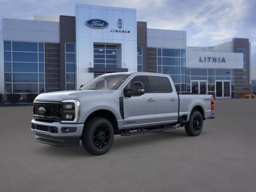 BLACK APPEARANCE PACKAGE front and rear black Ford ovals, box side decal (4x4, FX4 or Tremor) and ebony black fender vent surround dark fender badge, Rear Wheel Well Liners, Black Painted Front Grille Surround, Ebony Black Painted Mirror Caps, Tough Bed Spray-In Bedliner, tailgate-guard, black box bed tie-down hooks and black bed attachment bolts, Body Color Front & Rear Bumpers, Wheels: 20 Ebony Black High Gloss, Black premium painted aluminum, gloss black hub cover/center ornament, Tires: LT275/65Rx20E BSW Automatic Transmission, Spare may not be the same as road tire, 6 Ebony Black Angular Running Boards, LARIAT PREMIUM PACKAGE lane departure warning, Pro Trailer Hitch Assist, Ford Co-Pilot 360 Assist 2.0, rear view camera and reverse brake assist, Pre-Collision Assist, Automatic Emergency Braking (AEB), pedestrian detection, forward collision warning, dynamic brake support and intersection assist, Post-Collision Braking, Lane-Keeping System, lane-keeping alert, lane-keeping aid and driver alert, Front & Rear Parking Sensors, Automatic High Beam, Adaptive Cruise Control w/Stop-and-Go, lane centering and predictive speed assist, Power-Sliding Rear-Window w/Defrost, Pro Trailer Backup Assist, trailer reverse guidance, ELECTRONIC-LOCKING W/3.31 AXLE RATIO, TAILGATE STEP & HANDLE, TRANSMISSION: TORQSHIFT 10-SPEED AUTOMATIC SelectShift and selectable drive modes: normal, eco, slippery roads, tow/haul and off-road. 2026 Ford Super Duty F-250 Pickup with Glacier Gray Metallic Tri-Coat exterior and Black Onyx interior features a 8 Cylinder Engine with 405 HP at 5000 RPM*. Approx. Original Base Sticker Price: $90,100*.
