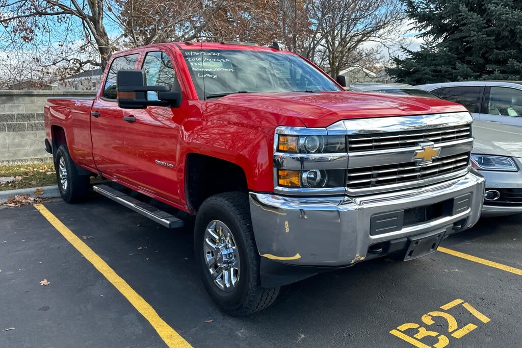 WT CONVENIENCE PACKAGE includes (AKO) tinted windows, (KI4) 110V outlet, (AQQ) Remote Keyless Entry, (A91) remote locking tailgate, (UVC) Rear Vision Camera and (DL8) outside, heated power-adjustable mirrors. TRAILERING EQUIPMENT Trailering hitch platform 2.5 with a 2.0 insert for HD, 7-wire harness with independent fused trailering circuits mated to a 7-way sealed connector to hook up parking lamps, backup lamps, right and left turn signals, an electric brake lead, battery and a ground, The trailer connector also includes the 4-way for use on trailers without brakes - park, brake/turn lamps Includes (JL1) trailer brake controller. AUDIO SYSTEM, CHEVROLET MYLINK RADIO 7 DIAGONAL COLOR TOUCH SCREEN, AM/FM STEREO with seek-and-scan and digital clock, includes Bluetooth® streaming audio for music and select phones; featuring Android Auto® and Apple CarPlay® capability for compatible phone (Includes (UQ3) 6-speaker audio system, (UE1) OnStar, (VV4) OnStar 4G LTE Wi-Fi Hotspot.), MIRRORS, OUTSIDE HEATED POWER-ADJUSTABLE VERTICAL TRAILERING, UPPER GLASS, MANUAL-FOLDING AND EXTENDING, BLACK. Includes integrated turn signal indicators consisting of 51 square inch flat mirror surface positioned over a 24.5 square inch convex mirror surface with a common head and lower convex spotter glass (convex glass is not heated and not power adjustable) and addition of Auxiliary cargo lamp for backing up (helps to see trailer when backing up with a trailer) and amber auxiliary clearance lamp and includes (DD8) auto-dimming inside rearview mirror.), GLASS, DEEP-TINTED, ENGINE, VORTEC 6.0L VARIABLE VALVE TIMING V8 SFI, E85-COMPATIBLE, FLEXFUEL capable of running on unleaded or up to 85% ethanol (360 hp [268.4 kW] @ 5400 rpm, 380 lb-ft of torque [515.0 N-m] @ 4200 rpm) (STD), TRANSMISSION, 6-SPEED AUTOMATIC, HEAVY-DUTY, ELECTRONICALLY CONTROLLED with overdrive and tow/haul mode. Includes Cruise Grade Braking and Powertrain Grade Braking (STD). 2016 Chevrolet Silverado 2500HD with Red Hot exterior and Dark Ash with Jet Black Interior Accents interior features a 8 Cylinder Engine with 360 HP at 5400 RPM*.