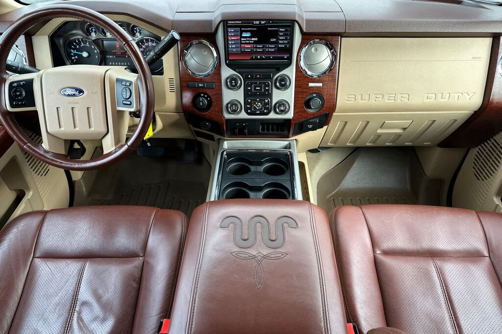 TOUGH BED SPRAY-IN BEDLINER tailgate-guard, black box bed tie-down hooks and black bed attachment bolts, ELECTRONIC LOCKING W/4.30 AXLE RATIO, TAILGATE STEP & HANDLE, HEATED REAR SEATS, KING RANCH PACKAGE unique King Ranch wheel center caps, unique accent color box top/tailgate moldings, unique King Ranch fender badges and unique front and rear floor mats w/King Ranch logo, King Ranch Chaparral Lthr-Wrapped Steering Wheel, audio controls, PowerScope Trailer-Tow Mirrors, power telescoping, power folding w/power heated glass, memory, heated convex spotter mirror and integrated clearance lights/turn signals, Body-Color Lower Bodyside Moldings, Accent Color Front Bumper, Body Color Mirror Caps on PowerScope Mirrors, Accent-Color Illuminated Angular Running Bars, Memory Power Adjustable Pedals, Accent Color Rear Bumper w/Step Pad, Painted Body Color Grille w/Chrome Insert, Unique Door Trim Panels, King Ranch leather insert and woodgrain applique, ENGINE: 6.2L 2-VALVE SOHC EFI NA V8 FLEX-FUEL (STD). 2014 Ford Super Duty F-250 Pickup with Ruby Red Metallic Tinted Clear Coat/Pale Adobe Metallic exterior and Adobe interior features a 8 Cylinder Engine with 385 HP at 5500 RPM*.