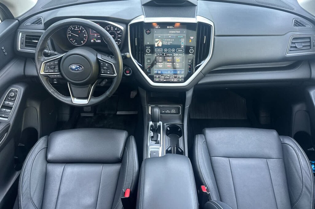 TECHNOLOGY PACKAGE Retractable Cargo Area Cover, Satin Chrome Power-Folding Exterior Power Mirrors, integrated turn signals, Panoramic Power Moonroof w/UV/Drk Tint Dual Glass, front tilt up and external retracting w/auto-open/close, power sunshade and rear fixed glass, Cabin Connect, Enables communication from the front seats throughout the cabin without the need to speak loudly, Once the button on the Center Information Display (CID) is pressed, voices from the driver and front passenger are picked up by the overhead console microphone and outputted through the rear audio speakers, This feature combined w/the cabin view mirror, enables eye contact and provides a conversation to occur w/the rear seat passengers, helping to reduce distractions on the driver, Surround View Monitor System, AERO CROSSBAR SET Aero crossbars do not support the use of roof top tents. 2023 Subaru Ascent with Cosmic Blue Pearl exterior and Slate Black interior features a 4 Cylinder Engine with 260 HP at 5600 RPM*.